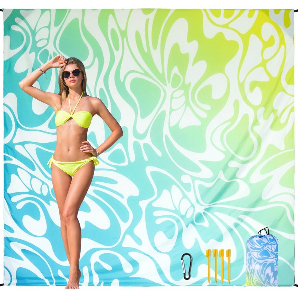 Beach Blanket Sandproof Extra Large Beach Mat Adults Waterproof Quick Drying Sand Free Mat Made by Premium Polyester with 4 Stakes & 4 Corner Pockets for Outdoor Travel Camping Hiking(Bb-dh-bluegreen-gradient)