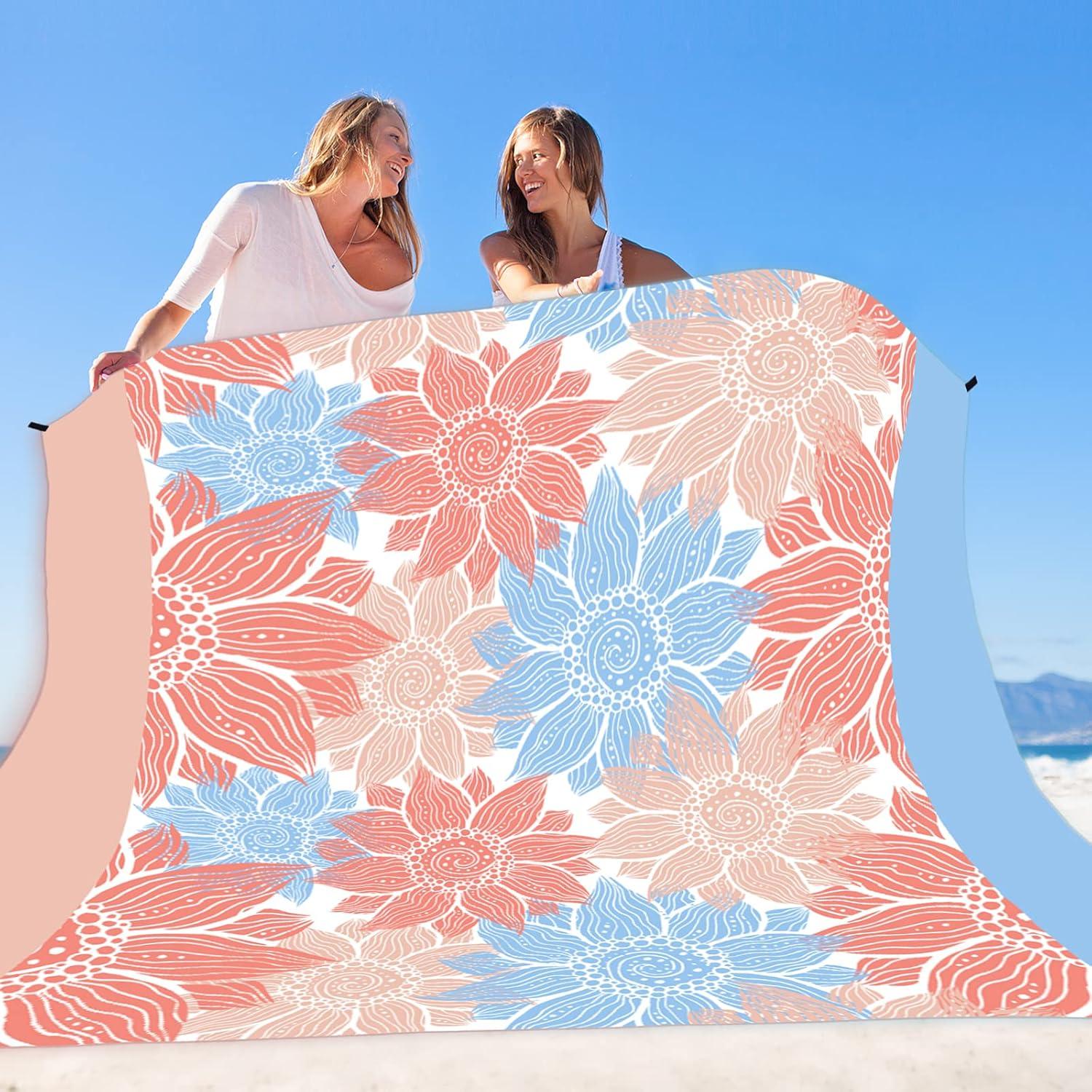 Beach Blanket Sandproof Extra Large Beach Mat Adults Waterproof Quick Drying Sand Free Mat Made by Premium Polyester with 4 Stakes & 4 Corner Pockets for Outdoor Travel Camping Hiking(Blue Flower)