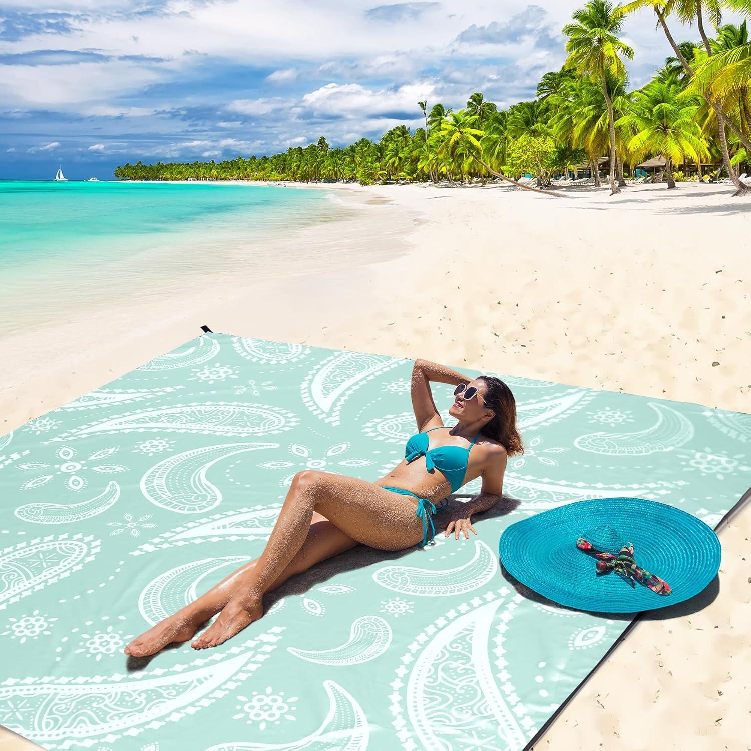 Beach Blanket Sandproof Extra Large Beach Mat Adults Waterproof Quick Drying Sand Free Mat Made by Premium Polyester with 4 Stakes & 4 Corner Pockets for Outdoor Travel Camping Hiking(Paisley-green)