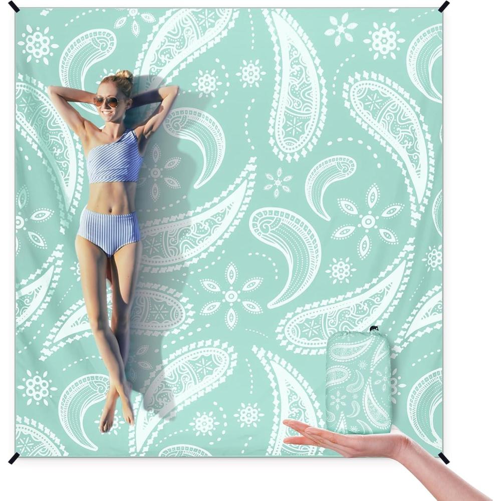 Beach Blanket Sandproof Extra Large Beach Mat Adults Waterproof Quick Drying Sand Free Mat Made by Premium Polyester with 4 Stakes & 4 Corner Pockets for Outdoor Travel Camping Hiking(Paisley-bluegreygreen)