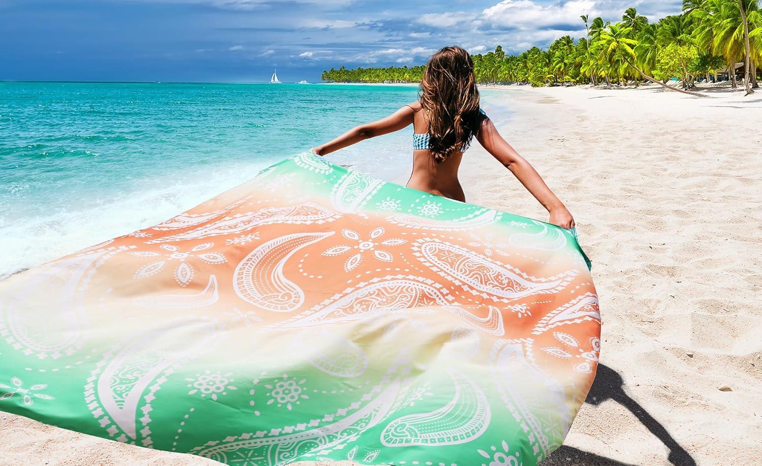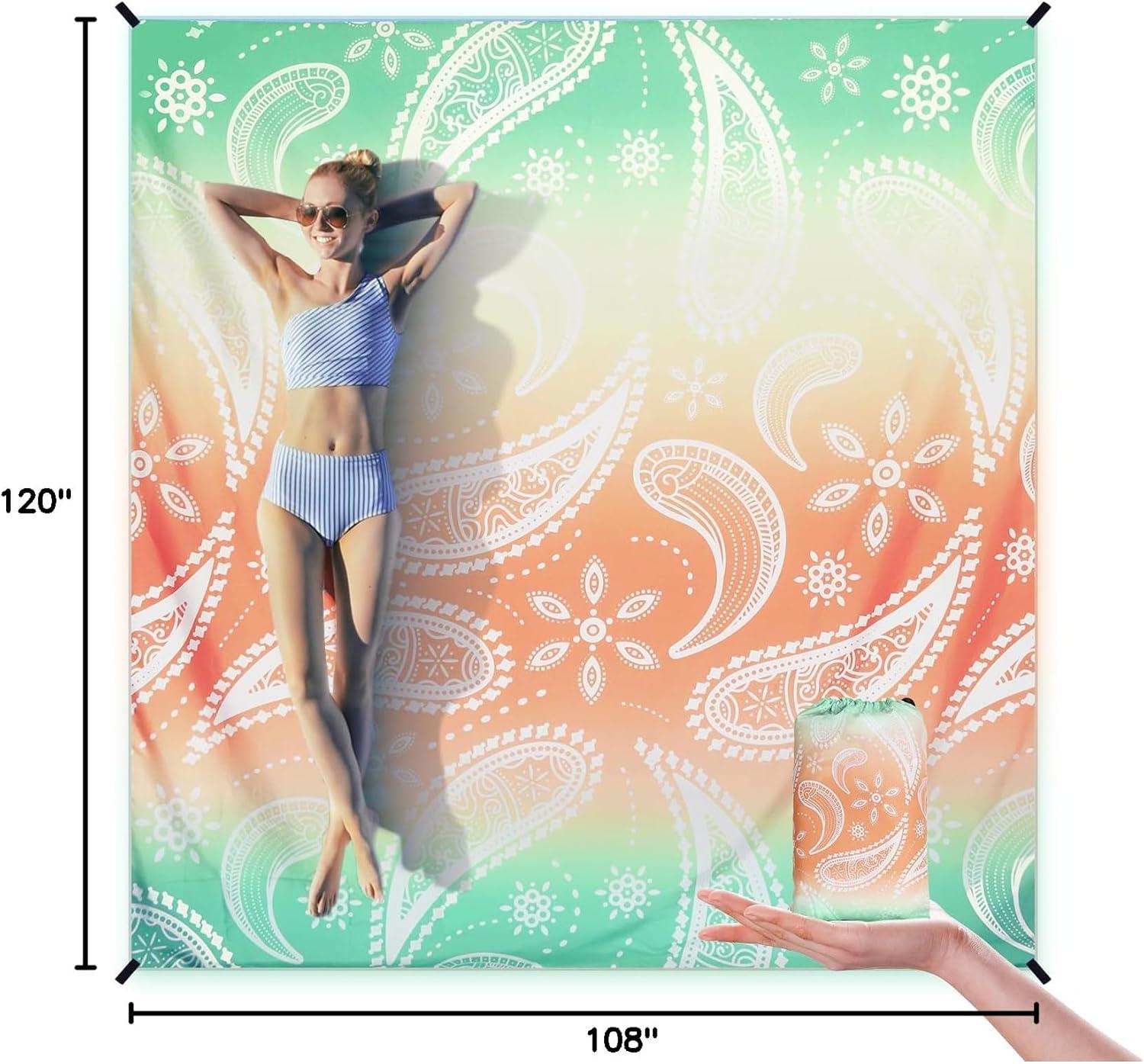 Beach Blanket Sandproof Extra Large Beach Mat Adults Waterproof Quick Drying Sand Free Mat Made by Premium Polyester with 4 Stakes & 4 Corner Pockets for Outdoor Travel Camping Hiking(Psl-greenorange)