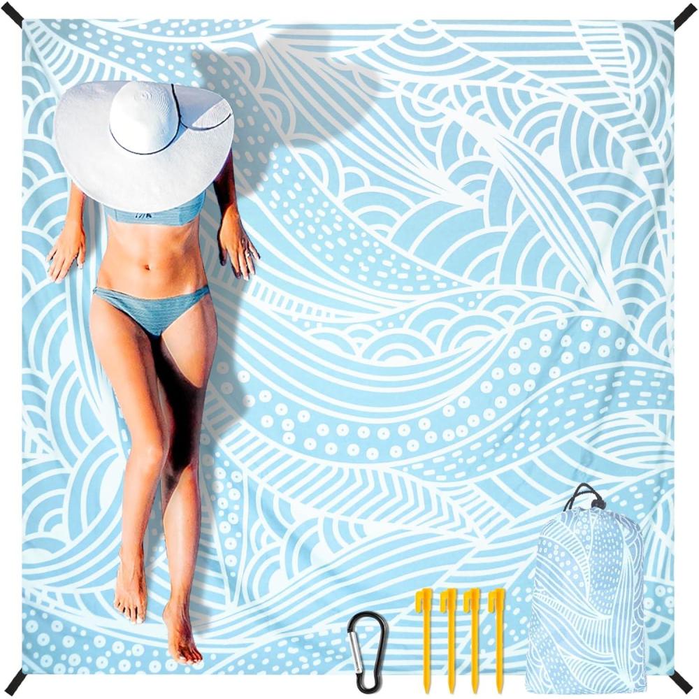 Beach Blanket Sandproof Extra Large Beach Mat Adults Waterproof Quick Drying Sand Free Mat Made by Premium Polyester with 4 Stakes & 4 Corner Pockets for Outdoor Travel Camping Hiking(Ripple-blue)