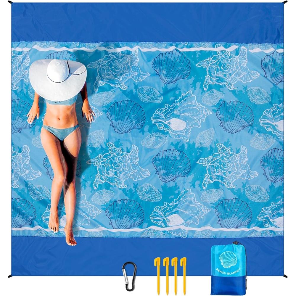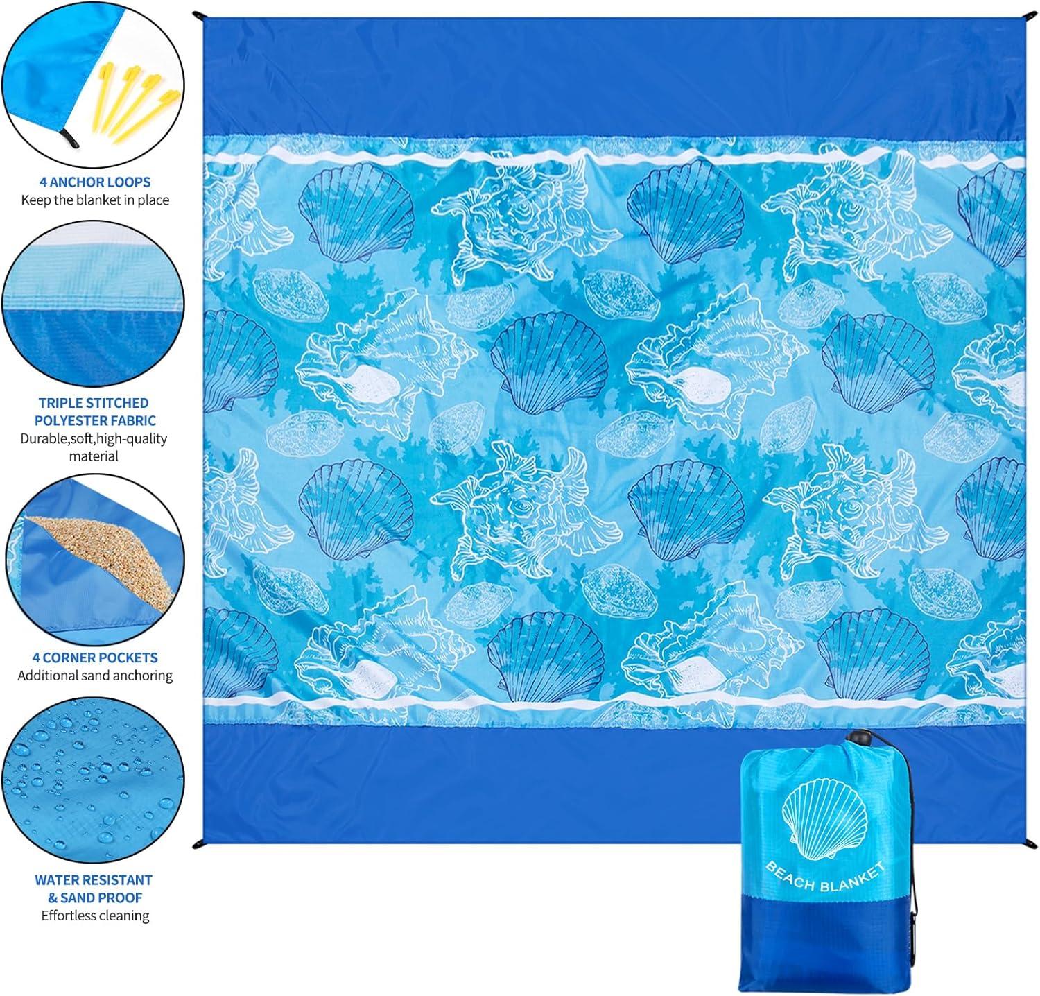 Beach Blanket Sandproof Extra Large Beach Mat Adults Waterproof Quick Drying Sand Free Mat Made by Premium Polyester with 4 Stakes & 4 Corner Pockets for Outdoor Travel Camping Hiking(Seashells)
