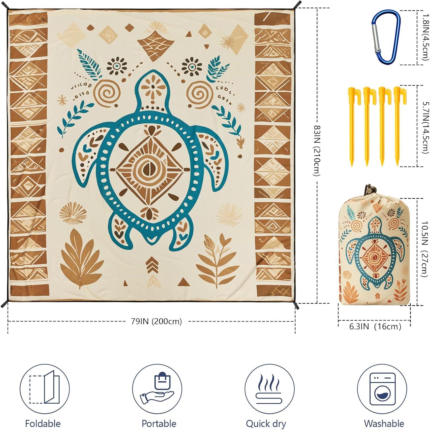 Beach Blanket Waterproof Sandproof Beach Mat 79″ X 83″/10’x9’for 2-8 Adults Quick Drying Outdoor Picnic Mat Beach Accessories for Travel, Camping, Hiking(Beige Sea Turtle – Geometric)