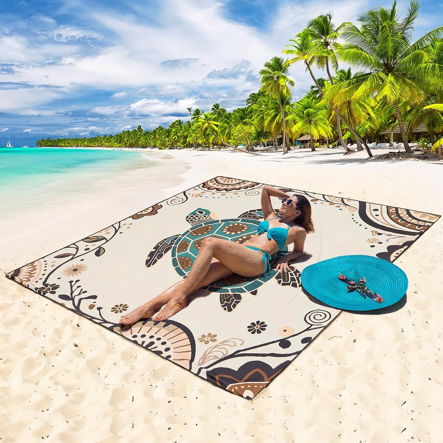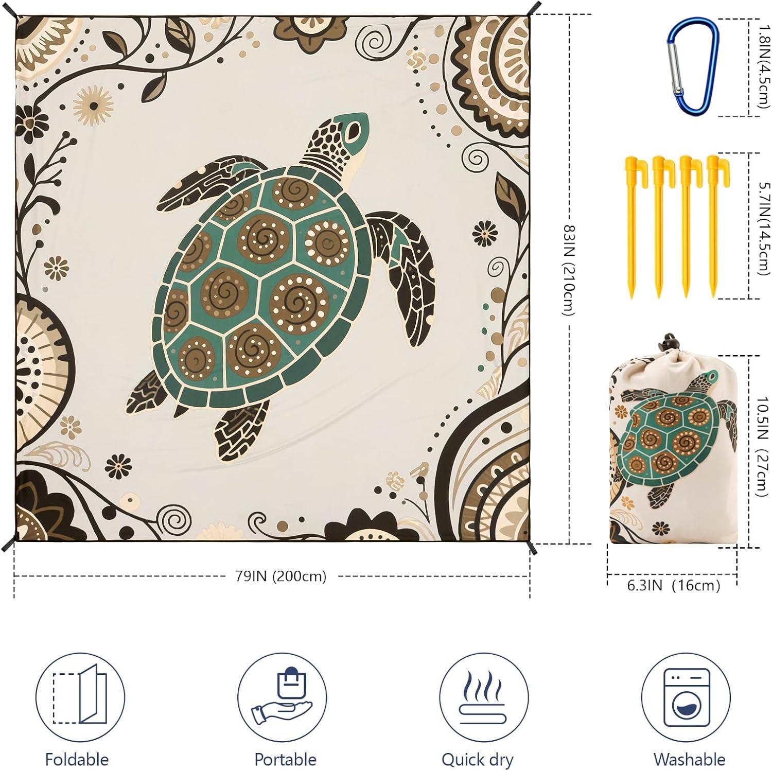 Beach Blanket Waterproof Sandproof Beach Mat 79" X 83"/10'x9'for 2-8 Adults Quick Drying Outdoor Picnic Mat Beach Accessories for Travel, Camping, Hiking(Beige Sea Turtle - Mandala)