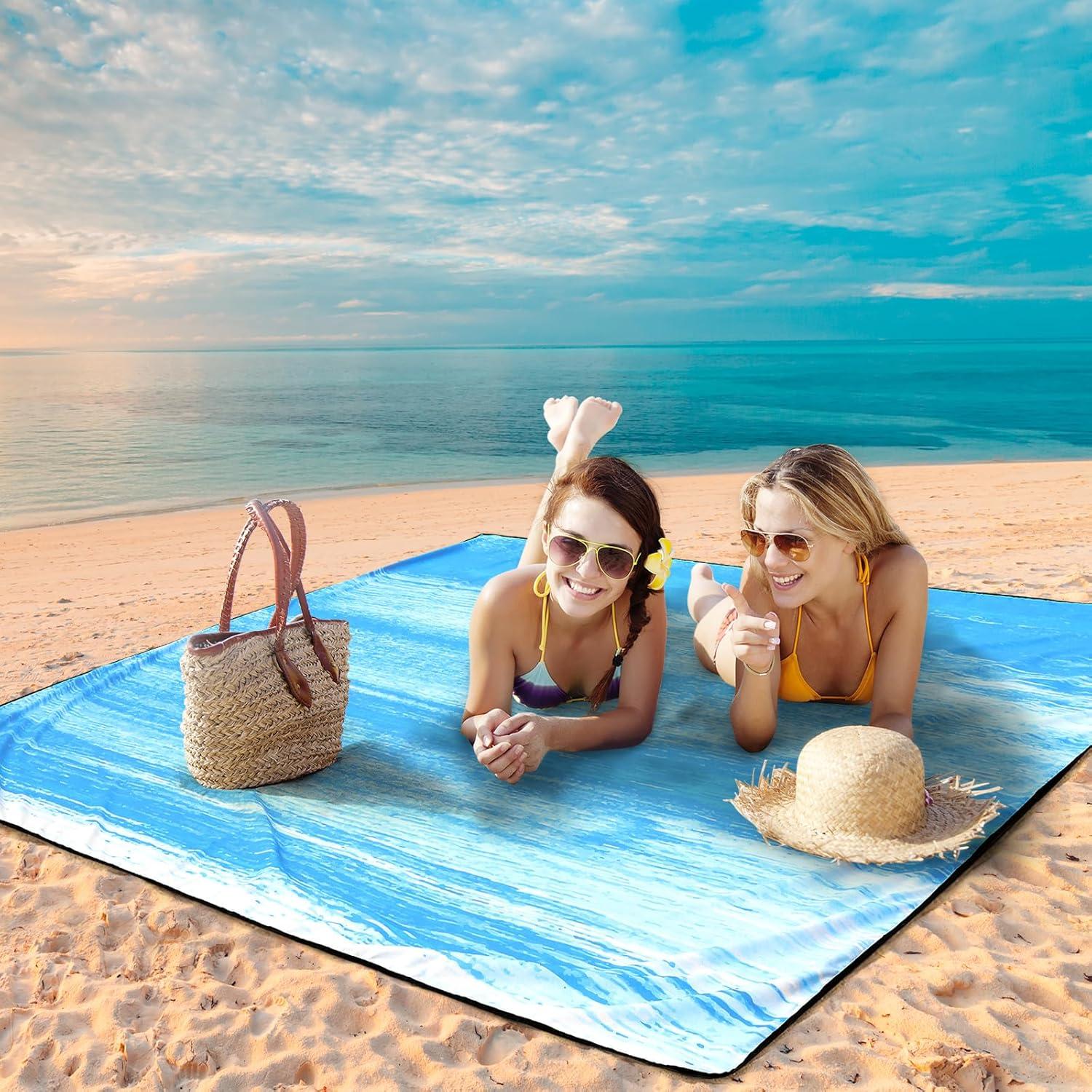 Beach Blanket Waterproof Sandproof Beach Mat 79" X 83"/10'x9'for 2-8 Adults Quick Drying Outdoor Picnic Mat Beach Accessories for Travel, Camping, Hiking(Blue-green Tinted Gradation)