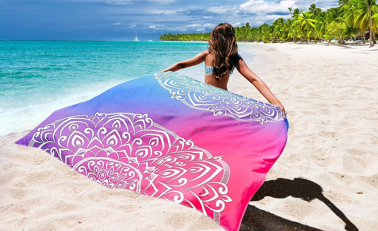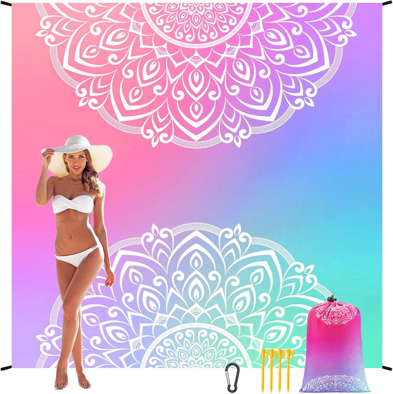 Beach Blanket Waterproof Sandproof Beach Mat 79″ X 83″/10’x9’for 2-8 Adults Quick Drying Outdoor Picnic Mat Beach Accessories for Travel, Camping, Hiking(Bluepink)