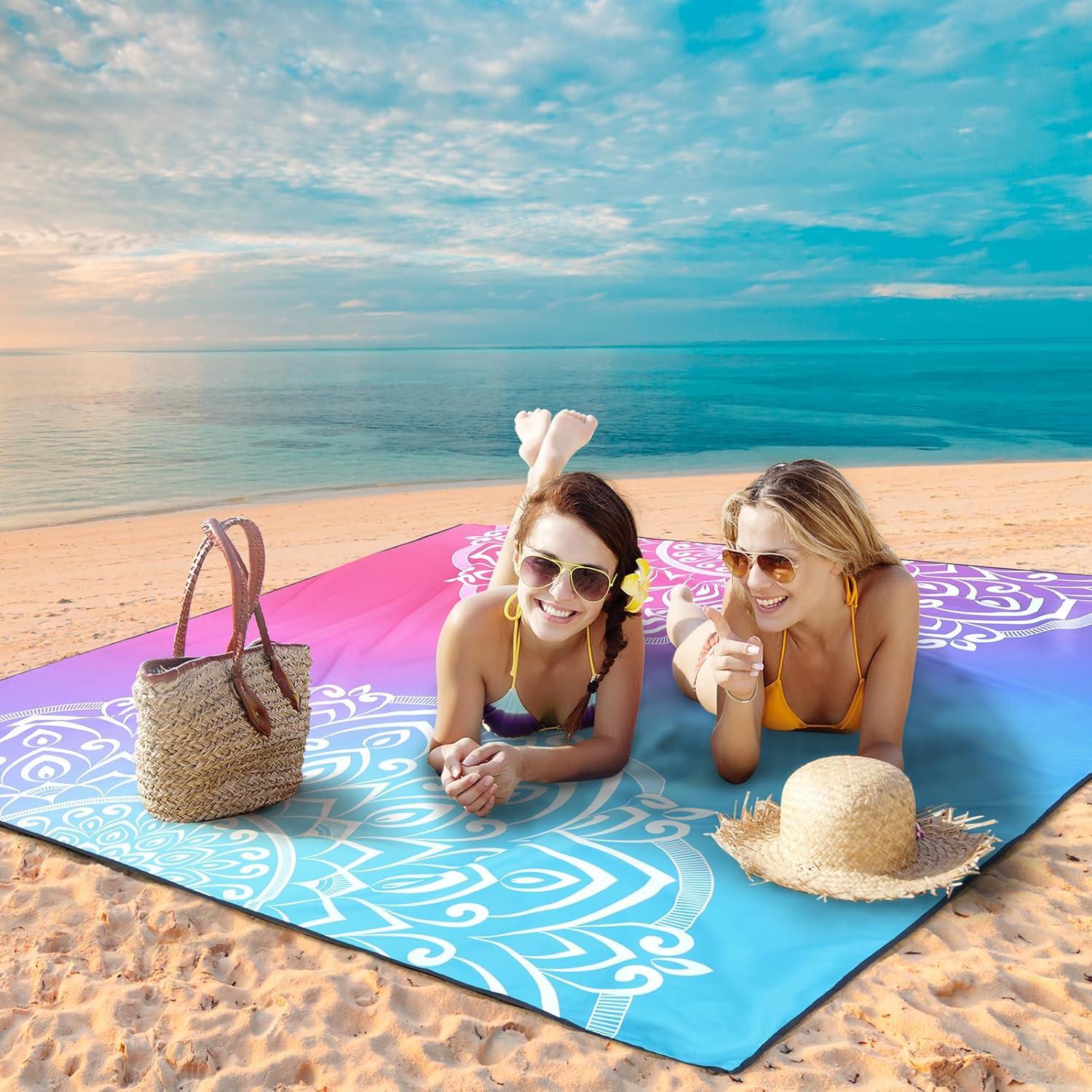 Beach Blanket Waterproof Sandproof Beach Mat 79" X 83"/10'x9'for 2-8 Adults Quick Drying Outdoor Picnic Mat Beach Accessories for Travel, Camping, Hiking(Bluepink)
