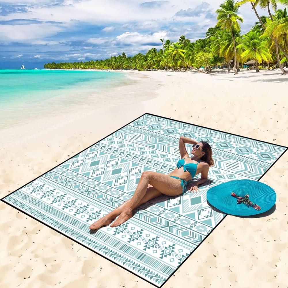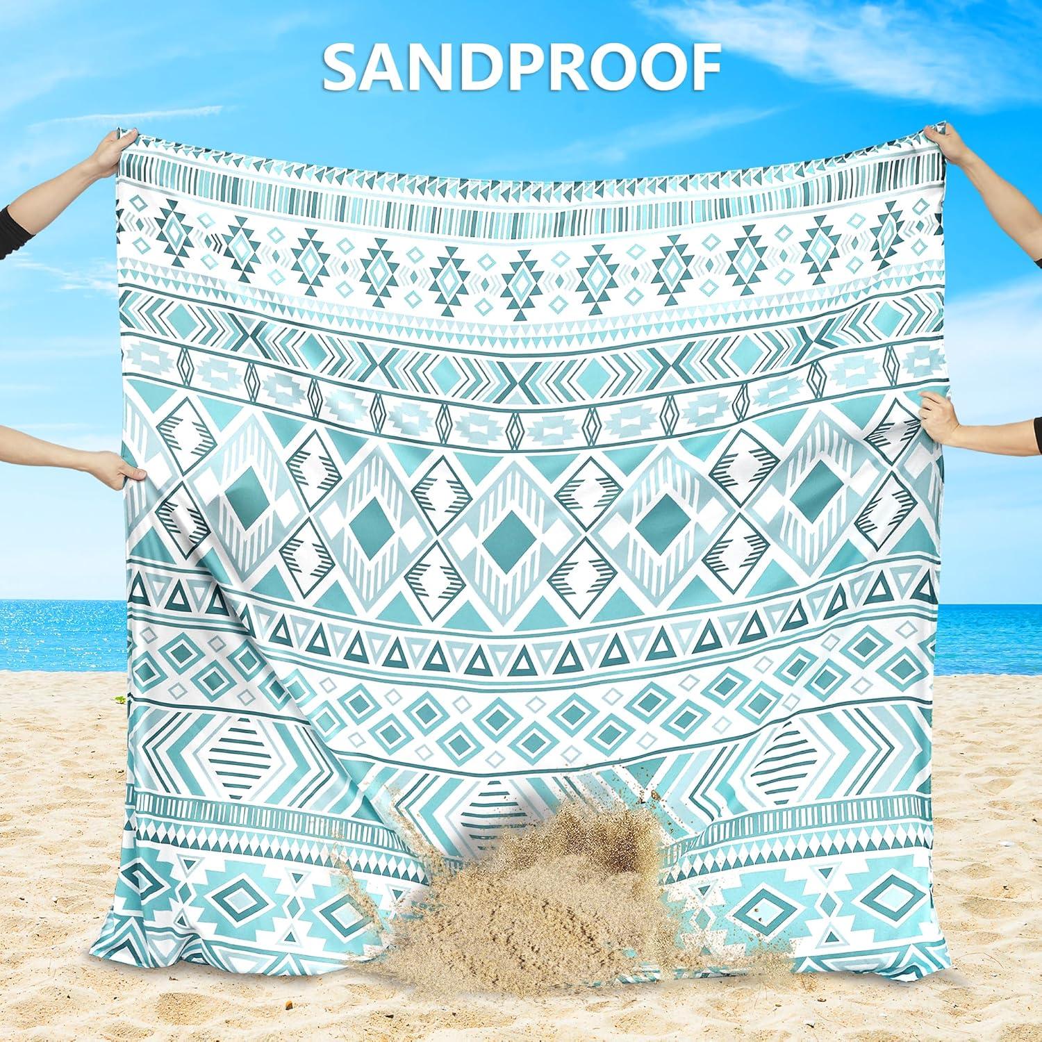 Beach Blanket Waterproof Sandproof Beach Mat 79″ X 83″/10’x9’for 2-8 Adults Quick Drying Outdoor Picnic Mat Beach Accessories for Travel, Camping, Hiking(Boho Style Green)