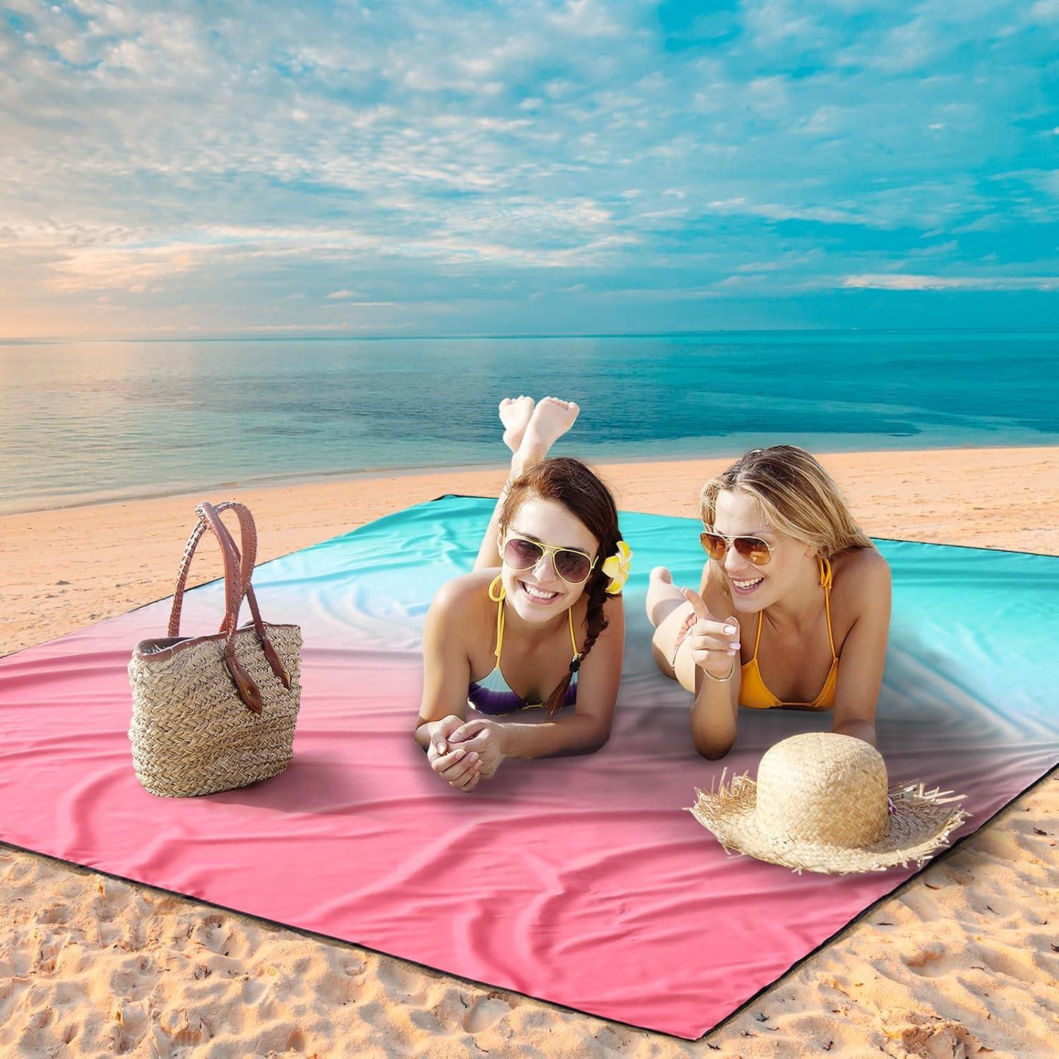 Beach Blanket Waterproof Sandproof Beach Mat 79" X 83"/10'x9'for 2-8 Adults Quick Drying Outdoor Picnic Mat Beach Accessories for Travel, Camping, Hiking(Gradient Pink Green)