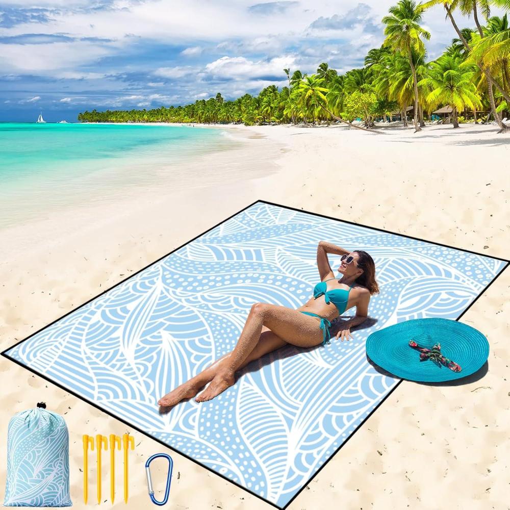 Beach Blanket Waterproof Sandproof Beach Mat 79″ X 83″/10’x9’for 2-8 Adults Quick Drying Outdoor Picnic Mat Beach Accessories for Travel, Camping, Hiking(Ripple Light Blue)